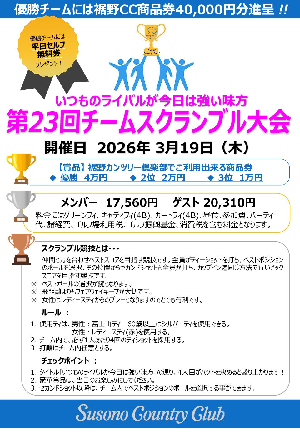 今年もやります!チームスクランブル大会 いつものライバルと4人力を合わせビッグスコアを出しましょう✌ 予約はホームページ予約サイト及びお電話(055-997-0505)にて受付中❕